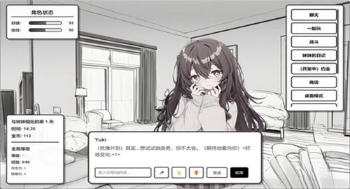 妹居物语汉化版是一款十分好玩有趣的养成类型的游戏,在这款游戏中,玩家将与邻居家的妹妹Yuki一同生活,你可以通过AI互动的方式与她聊天,从而增进彼此的好感,当好感度提升到一定程度后,你还可以与她一起外出游玩,随着时间推移,你将成为她生命中独一无二的存在,此外,游戏融合了实时对话、Live2D动画和实时配音技术,玩家可以更换Yuki的服装,并通过语音与她进行互动聊天,游戏时间与现实时间同步,不同时段和节日的对话将带来不同的反馈。