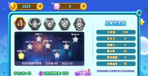 第三种方式是为宇宙火花充能,充能过程需要消耗宇宙水晶,而宇宙水晶同样可以通过闯关来获取。另外需要说明的是,宇宙火花带来的加成效果对所有角色都适用,因此大家一定要记得经常给它充能哦!