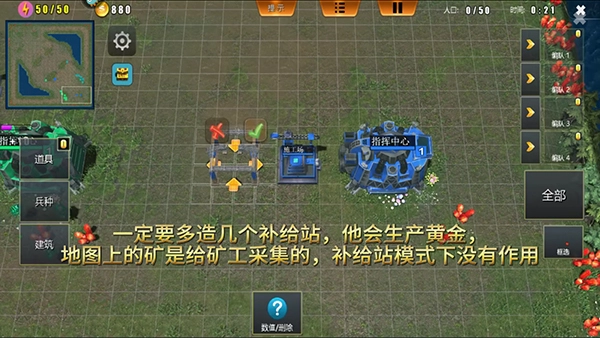 不过在游戏里大家务必要多建造几个补给站,它能够产出黄金。地图上的矿石原本是供矿工采集的,但在补给站模式下这些矿石就失去作用了。