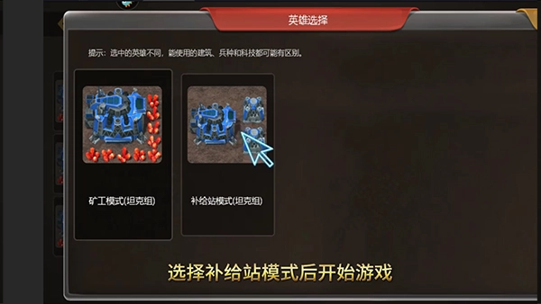 选择补给站模式后开始游戏,不同英雄的选择会导致可建造的建筑和兵种在声音方面存在较大差异。