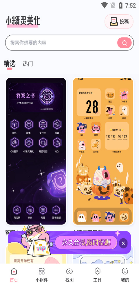 用户打开并登录小精灵美化后,进入首页就可以选择自己认为好看的手机桌面样式进行一键替换,也可以在顶部搜索框中搜索自己想要的手机桌面样式