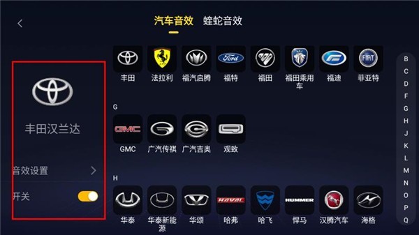 2、进入音效设置页面,挑选与你车型匹配的选项,如此便能依据你的车型来运用音效。