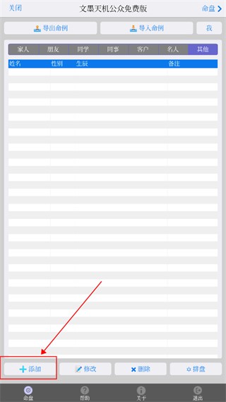 初次使用文墨天机App的用户,常常会按照以往使用其他App的操作习惯,每次排盘时都先在“命例”页面点击“添加”按钮(如下图所示)。如此操作虽能完成排盘,但过程稍显繁琐,还需频繁切换页面。实际上,存在更为简便的操作方式。