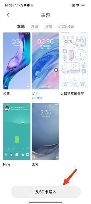 3、当进入主题界面后,点击下方的“从SD卡导入”选项,接着选择对应的.mtz文件就行。