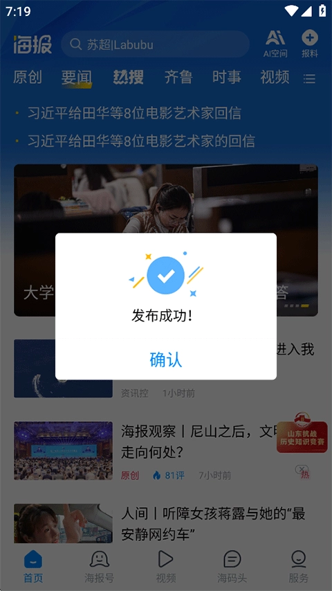 海报新闻是一款融合新闻资讯与生活服务功能的综合性移动服务手机客户端。作为国内主流新媒体平台,它以“立足山东、争创全国一流、面向世界”为发展方向,坚守“速度、深度、温度”的内容宗旨,为用户推送及时、权威且富有人文关怀的新闻内容。用户在此既能深入了解国内外重大事件的专业解读,又能便捷使用实时缴费、高考信息查询等便民服务,从而满足资讯获取与生活服务的双重需求。