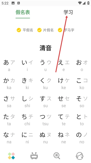 1、在假名表页面,可查看平假名、片假名与罗马字的对应表(如清音部分),点击顶部“学习”标签,可切换至假名学习模块。