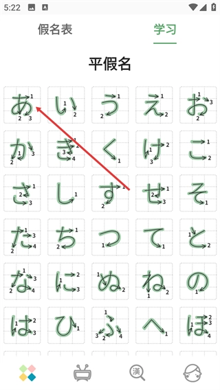 2、进入学习页面的平假名板块,展示平假名的书写笔顺(标注数字顺序),点击具体假名(如“あ”),可进入该假名的详细学习页面。