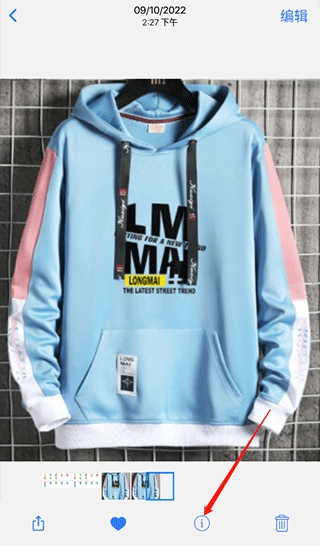 1、点击界面底部的感叹号图标,就能查看照片的基本信息详情。