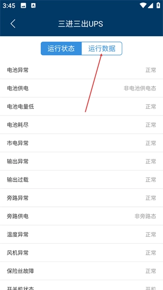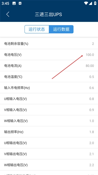 4、点击【运行数据】标签,可查看【电池剩余容量】-【电池电压】-【相电压】等详细运行参数。
