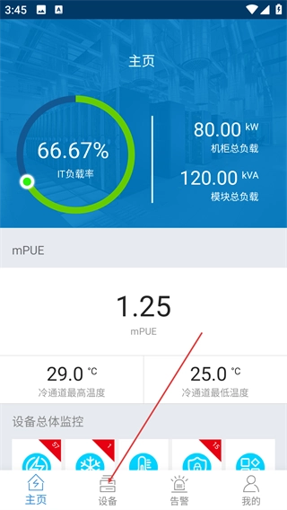 1、进入主页可查看【IT负载率】-【mPUE】-【冷通道温度】等数据,点击底部【设备】按钮进入设备列表页。