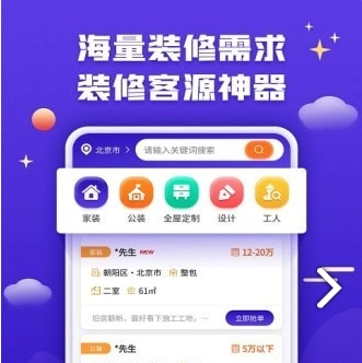 1、高品质业主装修需求,业主主动实时发布装修公司预约订单,简洁高效的装修接单!